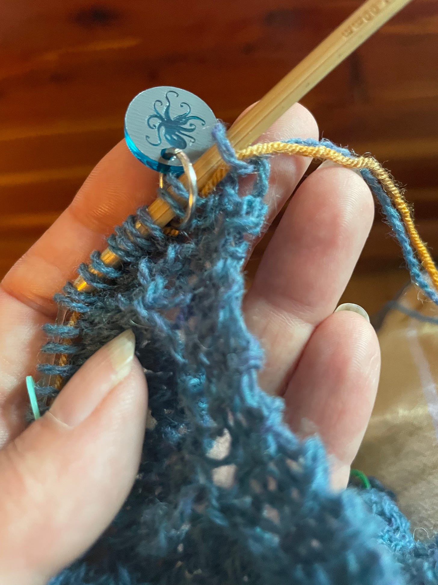 I put something called a “lifeline” in the Belclare Shawl by Erineen Designs that I am working on this summer. It’s this year’s featured knit-along for the Maine Yarn Cruise.