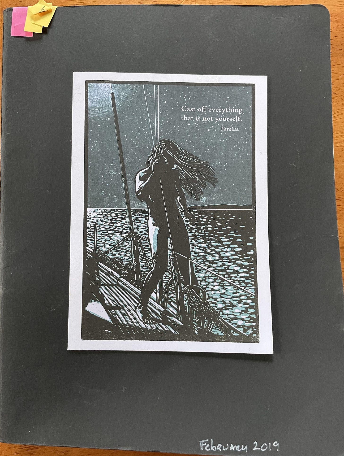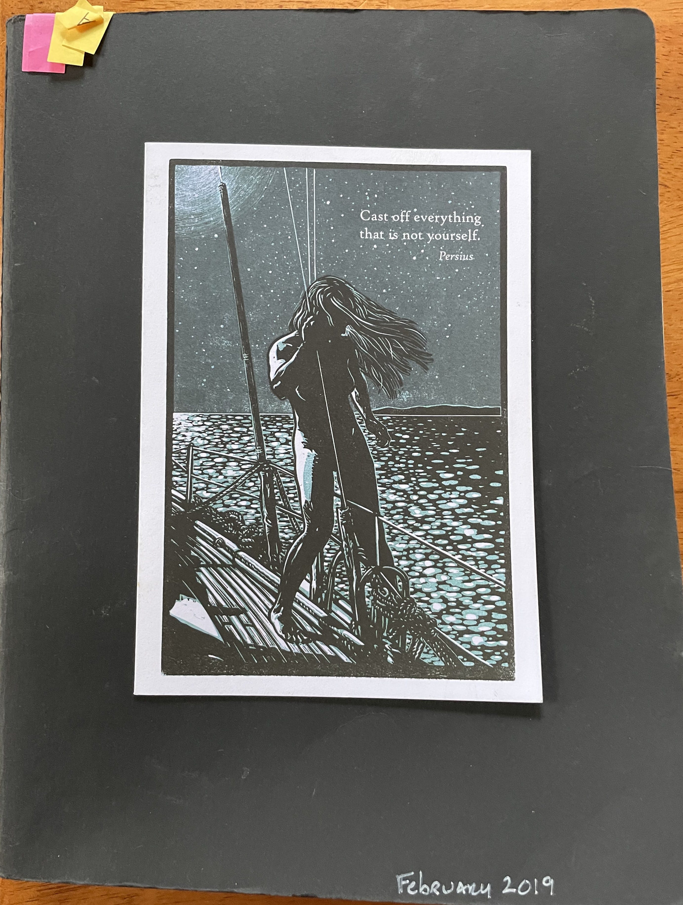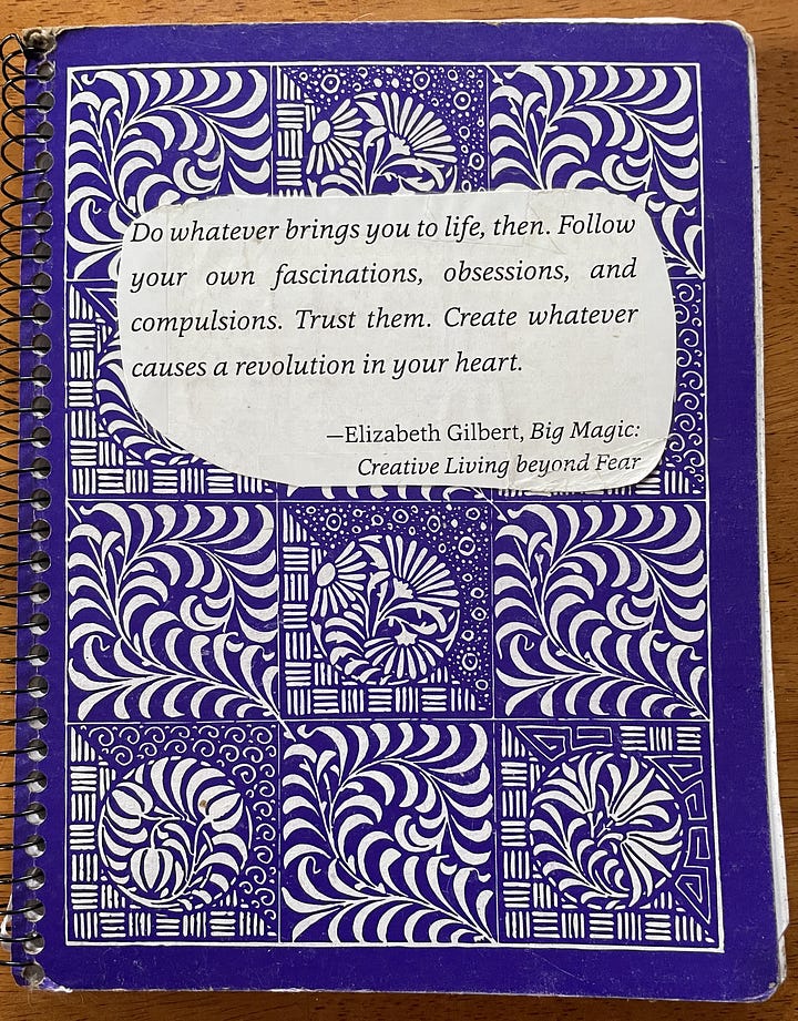 I started including the riffraff of my life in 2017. Now a writing nest is not just made of words. Musings might be illuminated by graduation programs, photos, newspaper clippings, tea tag wisdom, cookie fortunes, ticket stubs, and quotes. I draw some, but these are more pictographs than pictures. If this sounds like a good old-fashioned scrapbook, it probably is. Except no one else can read it.